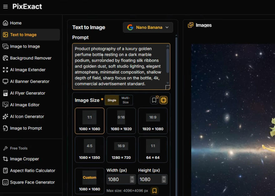 PixExact takes this power of AI and focuses it on one critical need for performance marketers: multi-platform ad images in exact sizes, generated from one core prompt in one click.