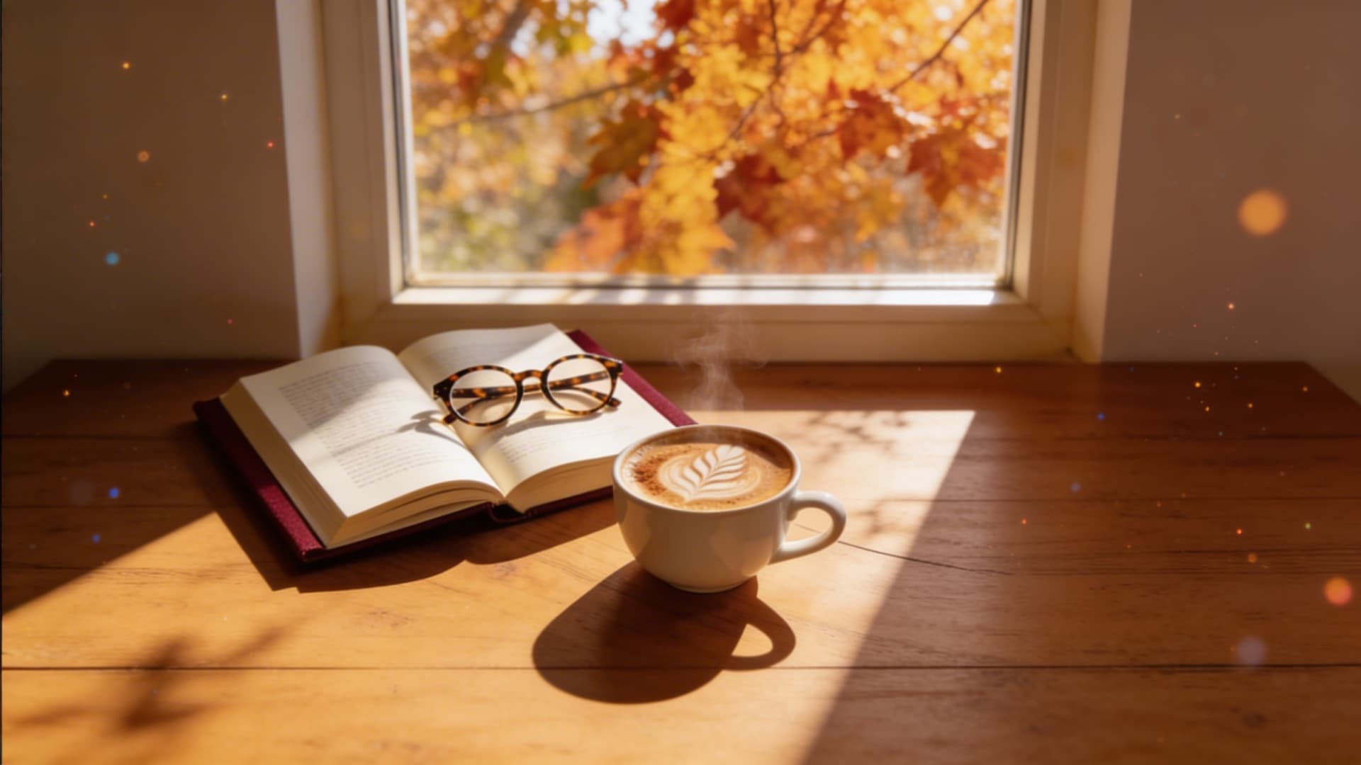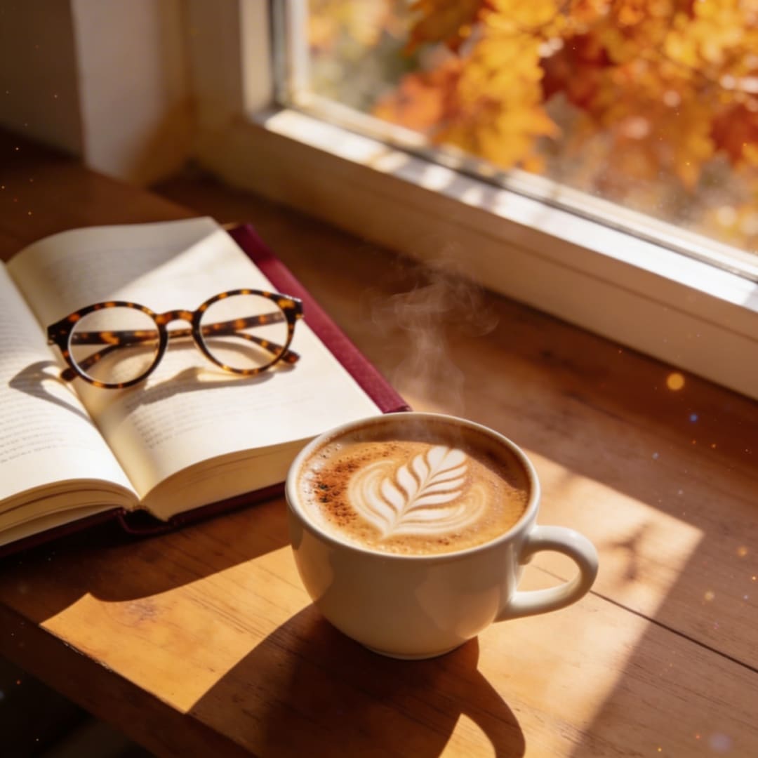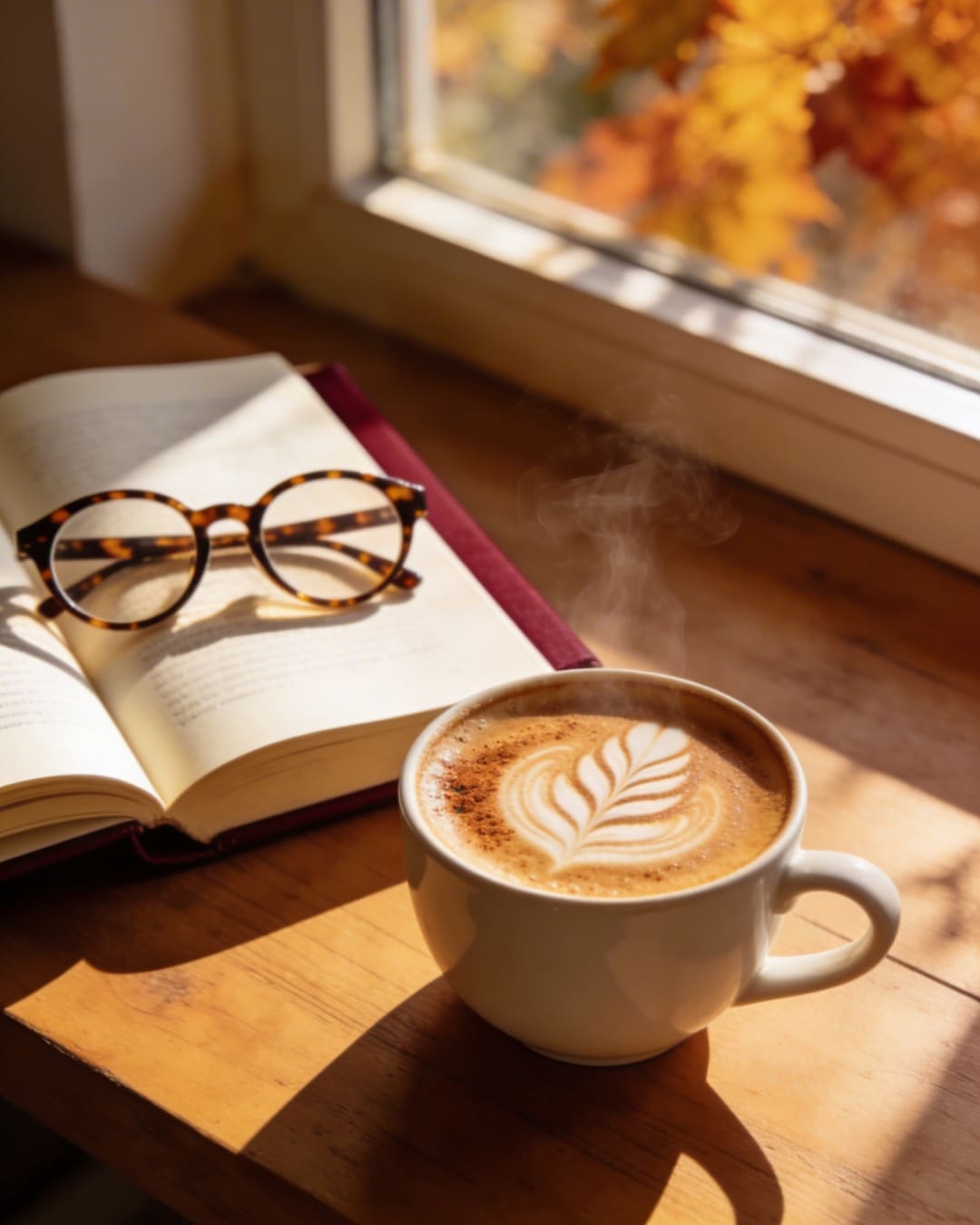 “A cup of pumpkin spice latte with beautiful latte art, next to a book and a pair of glasses, with warm autumn sunlight.”